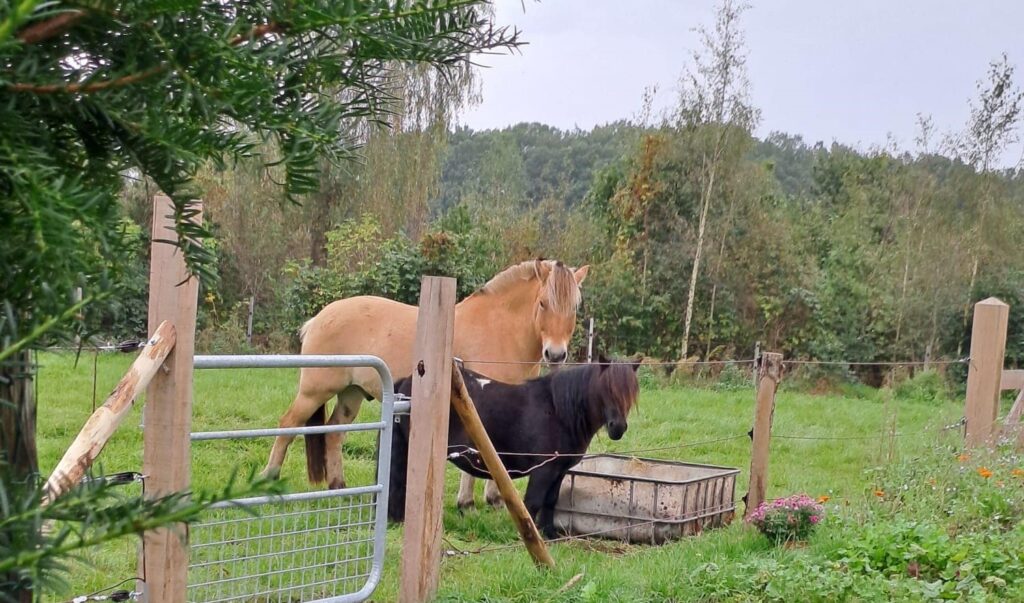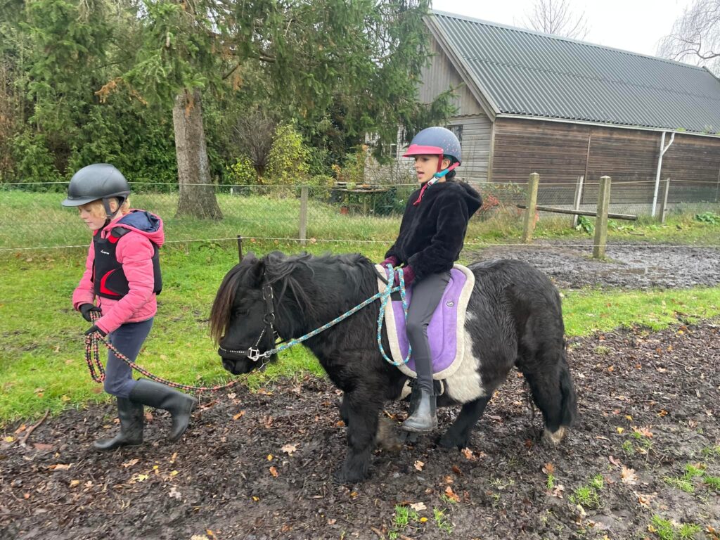 - Op pad te gaan met de pony: wandelend, rijdend, met menwagen, en eens per jaar met de pony het water in in de Eefsche beek. We ruimen de mest op, ook iets om te leren.